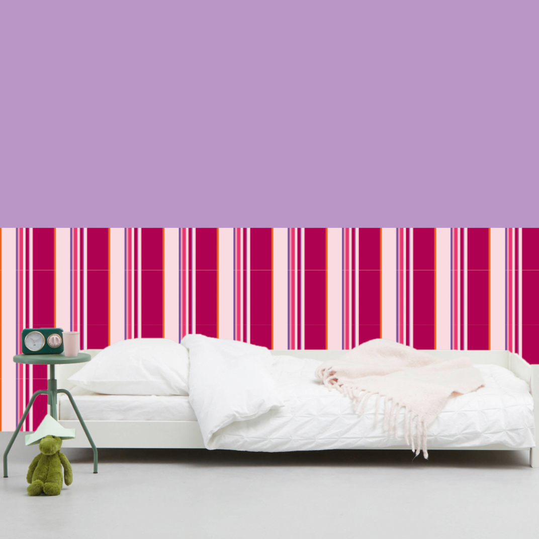 De speelse strepen zorgen voor een moderne, gezellige uitstraling zonder te druk te zijn. Het patroon is geschikt voor een volledige muur, of juist als accentwand achter het bed, de commode of speelhoek.