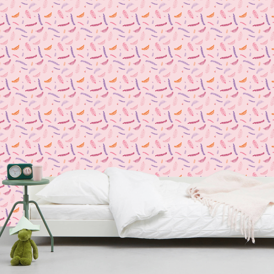 Zacht lichtroze behang met vrolijke takken in roze, oranje en paars